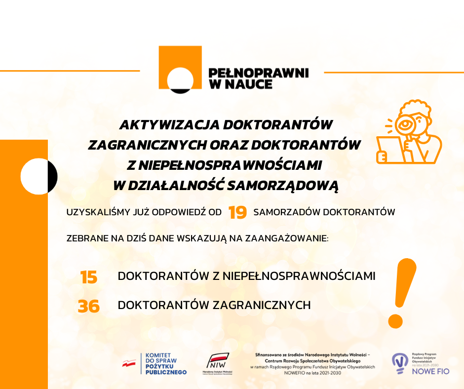 🔎Z danych, które już zebraliśmy od 19 samorządów wynika, że w okresie po 1 lipca 2023 r. w ich działania zaangażowano 15 doktorantów z niepełnosprawnościami oraz 36 doktorantów zagranicznych.
