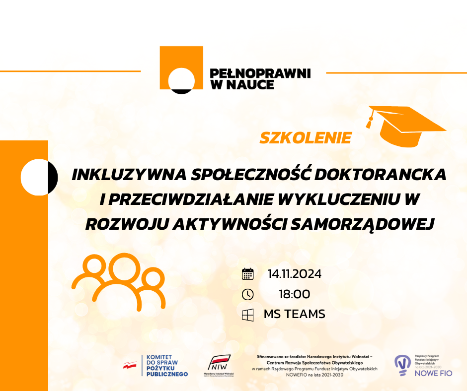 📣Serdecznie zapraszamy na bezpłatne szkolenie online pt.: Inkluzywna społeczność doktorancka i przeciwdziałanie wykluczeniu w rozwoju aktywności samorządowej, które odbędzie się 14 listopada (czwartek) o godzinie 18:00 za pośrednictwem MS Teams.