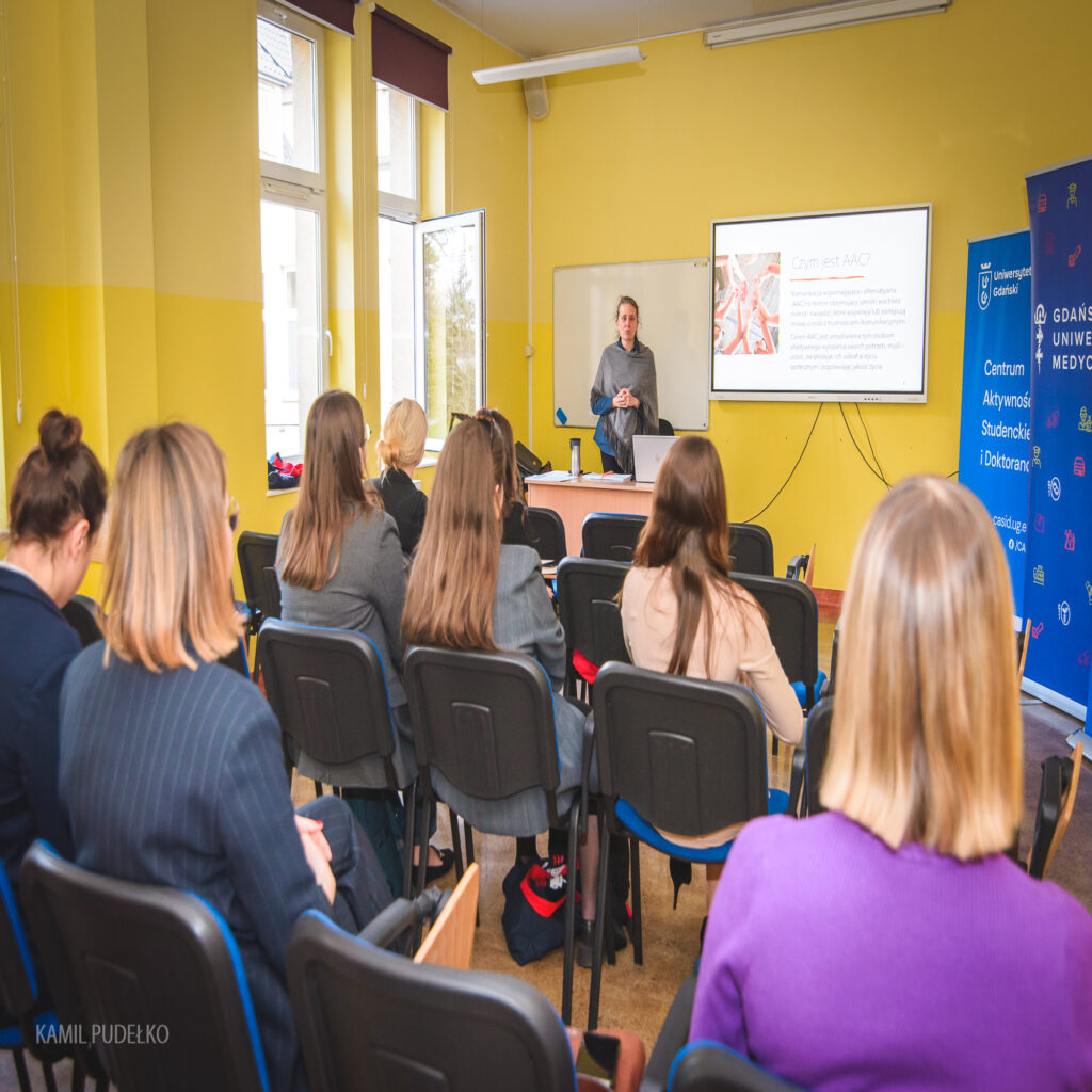 Warsztat „AAC – Komunikacja alternatywna i wspomagająca” został przeprowadzony w związku z cyklem warsztatów zatytułowanym „Zrozumieć osoby z niepełnosprawnościami”. Spotkanie odbyło się 26 kwietnia 2024 r. w Gdańskim Uniwersytecie Medycznym.